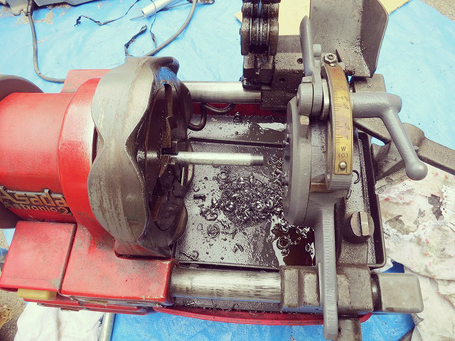 必要な水量が少ないのでそのサイズなんだと思いますが、大抵要らない場合も接続口は15A(15㎜くらい)の事が多く。さらに、接続してある既存の配管がステンレスの8Aとか10Aとかのねじ配管だったりするので、張り切ってねじ切りマシンの古い刃を引っ張り出して、小口径のねじ切り準備。