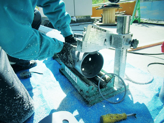 HOME > 設備屋雑記 > 現場だより > 切替工事 2026年1月6日 今日は浄水場の機器設置の現場。 ろ過の工程に新しい機器を追加する工事。 昨年までに機器設置が終わって、今日明日で機器を既存の配管と接続します。 明日浄水場を停止して配管を繋ぎ変えるので、その為の準備配管です。 メインの配管は塩ビ配管で、サイズは80㎜と細め。塩ビの配管としては太め。 このくらいの太さになると塩ビの配管でも切断は専用の機械の方が綺麗に仕上がります。 Twitter Share LINE